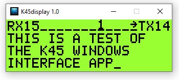 A common request from K45 users has been a way to control the K45 from a PC over the USB interface. K45display exports the To save desktop space, it's nice to be able to use use one keyboard for both ypur PC and the K45. Sometimes you want to save even more space by putting the K45 on a shelf and monitor the K45 display on your PC. K45 Display does both of these things. The PC communicates to the K45 over a USB interface. With few minor exceptions, the PC keyboard behaves just like it is attached to the K45. To activate the keyboard interface move your PC cursor to the K45 Display window and all keystrokes will go to the K45.